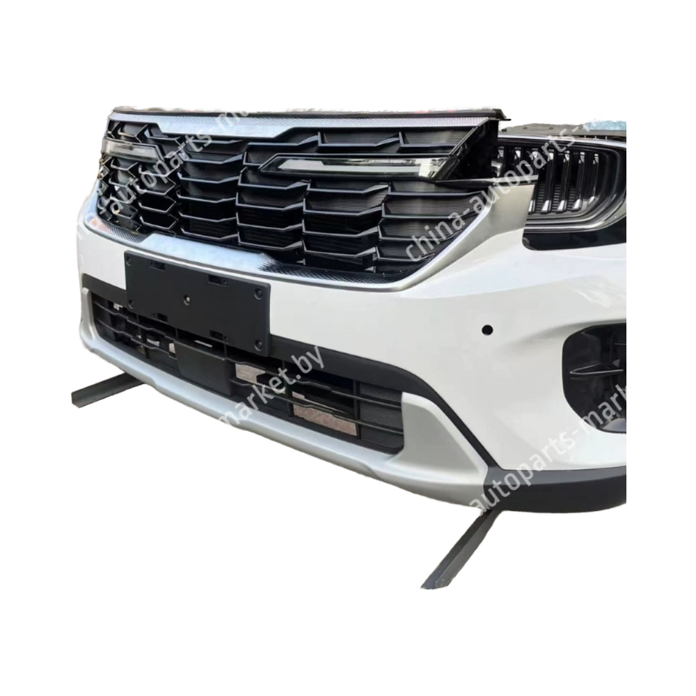 Seltos имеет характерную переднюю часть с массивной решеткой радиатора, которая визуально соединяет фары. В версиях GT Line решетка черная глянцевая с сотовидной структурой, в остальных — хромированная. В нижней части бампера расположены противотуманные фары или декоративные вставки. При заказе важно учитывать наличие систем помощи водителю, камер и радарных датчиков.